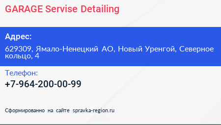 GARAGE Servise Detailing по адресу 629309, Ямало-Ненецкий АО, Новый Уренгой, Северное кольцо, 4 в дальнейшем Организация, размещена в следующих категориях: