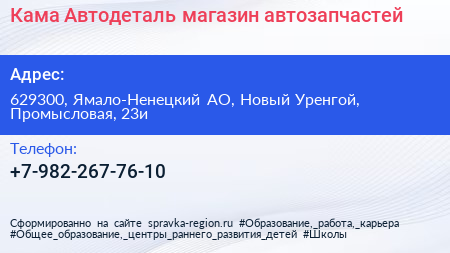 Кама-Автодеталь, магазин автозапчастей по адресу 629300, Ямало-Ненецкий АО, Новый Уренгой, Промысловая, 23и в дальнейшем Организация, размещена в следующих категориях: