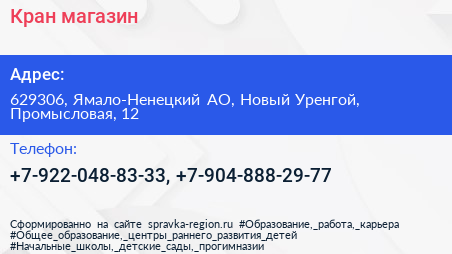 Кран, магазин по адресу 629306, Ямало-Ненецкий АО, Новый Уренгой, Промысловая, 12 в дальнейшем Организация, размещена в следующих категориях: