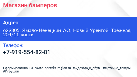 Магазин бамперов по адресу 629305, Ямало-Ненецкий АО, Новый Уренгой, Таёжная, 204/11 киоск в дальнейшем Организация, размещена в следующих категориях: