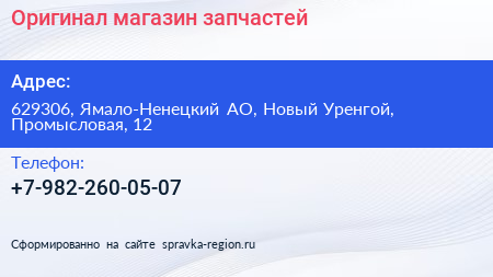 Оригинал, магазин запчастей по адресу 629306, Ямало-Ненецкий АО, Новый Уренгой, Промысловая, 12 в дальнейшем Организация, размещена в следующих категориях: