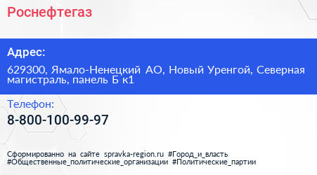Роснефтегаз по адресу 629300, Ямало-Ненецкий АО, Новый Уренгой, Северная магистраль, панель Б к1 в дальнейшем Организация, размещена в следующих категориях: