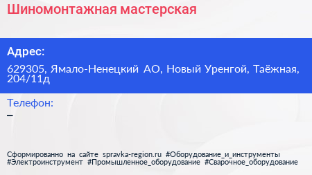 Шиномонтажная мастерская по адресу 629305, Ямало-Ненецкий АО, Новый Уренгой, Таёжная, 204/11д в дальнейшем Организация, размещена в следующих категориях: