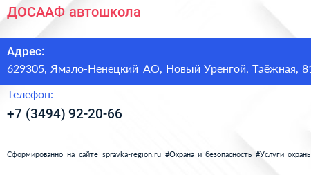 ДОСААФ, автошкола по адресу 629305, Ямало-Ненецкий АО, Новый Уренгой, Таёжная, 81 в дальнейшем Организация, размещена в следующих категориях: