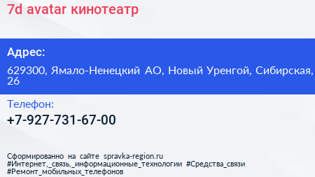 7d avatar, кинотеатр по адресу 629300, Ямало-Ненецкий АО, Новый Уренгой, Сибирская, 26 в дальнейшем Организация, размещена в следующих категориях: