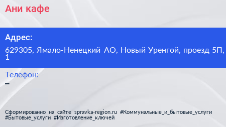 Ани, кафе по адресу 629305, Ямало-Ненецкий АО, Новый Уренгой, проезд 5П, 1 в дальнейшем Организация, размещена в следующих категориях: