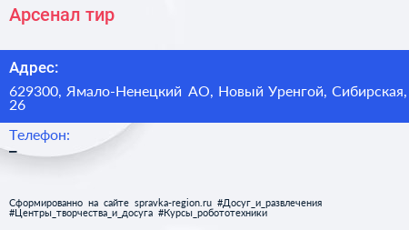 Арсенал, тир по адресу 629300, Ямало-Ненецкий АО, Новый Уренгой, Сибирская, 26 в дальнейшем Организация, размещена в следующих категориях: