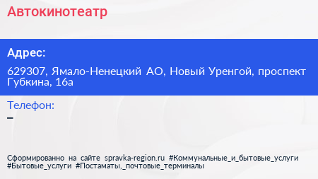 Автокинотеатр по адресу 629307, Ямало-Ненецкий АО, Новый Уренгой, проспект Губкина, 16а в дальнейшем Организация, размещена в следующих категориях: