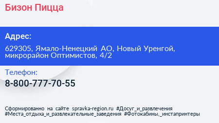 Бизон Пицца по адресу 629305, Ямало-Ненецкий АО, Новый Уренгой, микрорайон Оптимистов, 4/2 в дальнейшем Организация, размещена в следующих категориях: