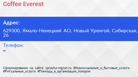 Coffee Everest по адресу 629300, Ямало-Ненецкий АО, Новый Уренгой, Сибирская, 26 в дальнейшем Организация, размещена в следующих категориях: