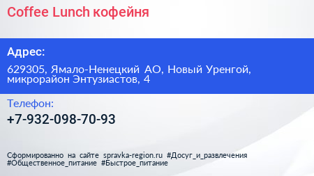Coffee Lunch, кофейня по адресу 629305, Ямало-Ненецкий АО, Новый Уренгой, микрорайон Энтузиастов, 4 в дальнейшем Организация, размещена в следующих категориях: