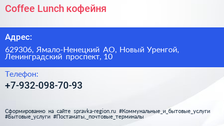 Coffee Lunch, кофейня по адресу 629306, Ямало-Ненецкий АО, Новый Уренгой, Ленинградский проспект, 10 в дальнейшем Организация, размещена в следующих категориях: