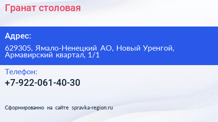 Гранат, столовая по адресу 629305, Ямало-Ненецкий АО, Новый Уренгой, Армавирский квартал, 1/1 в дальнейшем Организация, размещена в следующих категориях: