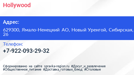 Hollywood по адресу 629300, Ямало-Ненецкий АО, Новый Уренгой, Сибирская, 26 в дальнейшем Организация, размещена в следующих категориях: