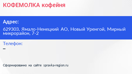 КОФЕМОЛКА, кофейня по адресу 629303, Ямало-Ненецкий АО, Новый Уренгой, Мирный микрорайон, 7-2 в дальнейшем Организация, размещена в следующих категориях: