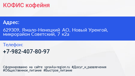 КОФИС, кофейня по адресу 629309, Ямало-Ненецкий АО, Новый Уренгой, микрорайон Советский, 7 к2а в дальнейшем Организация, размещена в следующих категориях: