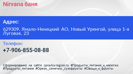 Nirvana, баня по адресу 629309, Ямало-Ненецкий АО, Новый Уренгой, улица 1-я Луговая, 23 в дальнейшем Организация, размещена в следующих категориях: