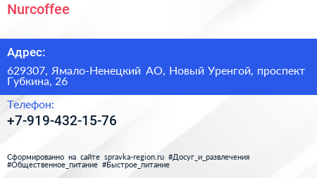 Nurcoffee по адресу 629307, Ямало-Ненецкий АО, Новый Уренгой, проспект Губкина, 26 в дальнейшем Организация, размещена в следующих категориях: