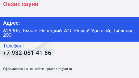 Оазис, сауна по адресу 629305, Ямало-Ненецкий АО, Новый Уренгой, Таёжная, 200 в дальнейшем Организация, размещена в следующих категориях: