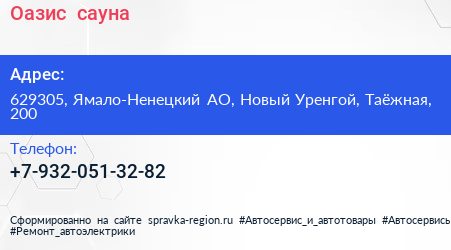 Оазис+, сауна по адресу 629305, Ямало-Ненецкий АО, Новый Уренгой, Таёжная, 200 в дальнейшем Организация, размещена в следующих категориях: