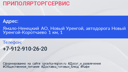 ПРИПОЛЯРТОРГСЕРВИС по адресу Ямало-Ненецкий АО, Новый Уренгой, автодорога Новый Уренгой-Коротчаево 1 км, 1 в дальнейшем Организация, размещена в следующих категориях:
