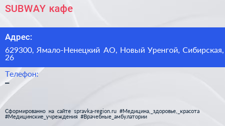 SUBWAY, кафе по адресу 629300, Ямало-Ненецкий АО, Новый Уренгой, Сибирская, 26 в дальнейшем Организация, размещена в следующих категориях: