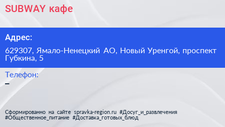 SUBWAY, кафе по адресу 629307, Ямало-Ненецкий АО, Новый Уренгой, проспект Губкина, 5 в дальнейшем Организация, размещена в следующих категориях: