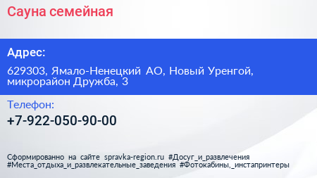 Сауна семейная по адресу 629303, Ямало-Ненецкий АО, Новый Уренгой, микрорайон Дружба, 3 в дальнейшем Организация, размещена в следующих категориях: