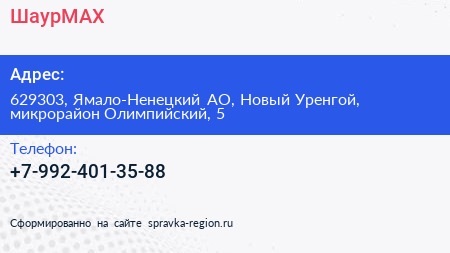 ШаурMAX по адресу 629303, Ямало-Ненецкий АО, Новый Уренгой, микрорайон Олимпийский, 5 в дальнейшем Организация, размещена в следующих категориях:
