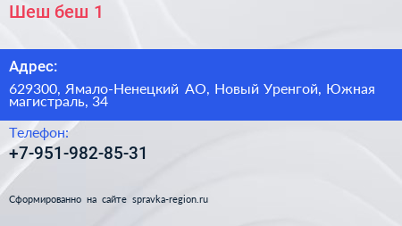 Шеш беш #1 по адресу 629300, Ямало-Ненецкий АО, Новый Уренгой, Южная магистраль, 34 в дальнейшем Организация, размещена в следующих категориях: