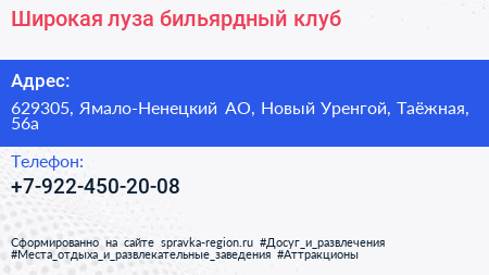 Широкая луза, бильярдный клуб по адресу 629305, Ямало-Ненецкий АО, Новый Уренгой, Таёжная, 56а в дальнейшем Организация, размещена в следующих категориях: