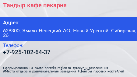 Тандыр, кафе-пекарня по адресу 629300, Ямало-Ненецкий АО, Новый Уренгой, Сибирская, 26 в дальнейшем Организация, размещена в следующих категориях: