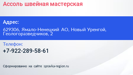 Ассоль, швейная мастерская по адресу 629306, Ямало-Ненецкий АО, Новый Уренгой, Геологоразведчиков, 2 в дальнейшем Организация, размещена в следующих категориях: