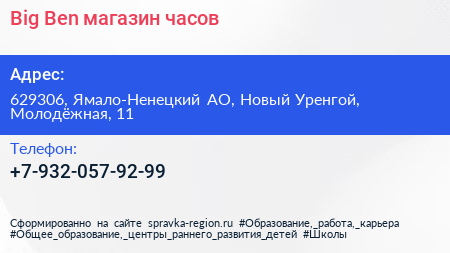 Big Ben, магазин часов по адресу 629306, Ямало-Ненецкий АО, Новый Уренгой, Молодёжная, 11 в дальнейшем Организация, размещена в следующих категориях: