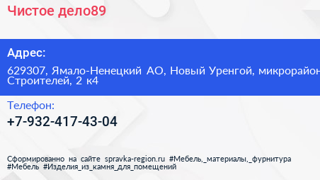 Чистое дело89 по адресу 629307, Ямало-Ненецкий АО, Новый Уренгой, микрорайон Строителей, 2 к4 в дальнейшем Организация, размещена в следующих категориях:
