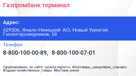 Газпромбанк, терминал по адресу 629306, Ямало-Ненецкий АО, Новый Уренгой, Геологоразведчиков, 18 в дальнейшем Организация, размещена в следующих категориях: