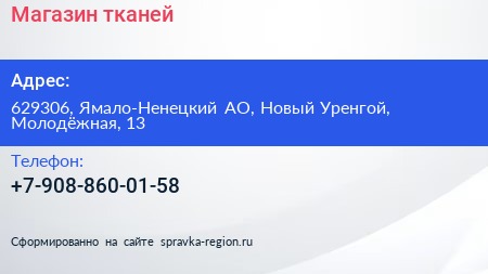 Магазин тканей по адресу 629306, Ямало-Ненецкий АО, Новый Уренгой, Молодёжная, 13 в дальнейшем Организация, размещена в следующих категориях: