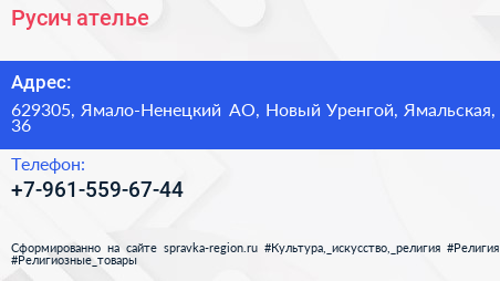 Русич, ателье по адресу 629305, Ямало-Ненецкий АО, Новый Уренгой, Ямальская, 36 в дальнейшем Организация, размещена в следующих категориях: