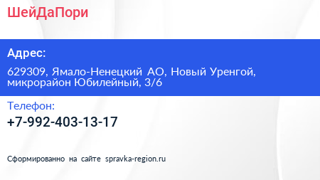 ШейДаПори по адресу 629309, Ямало-Ненецкий АО, Новый Уренгой, микрорайон Юбилейный, 3/6 в дальнейшем Организация, размещена в следующих категориях: