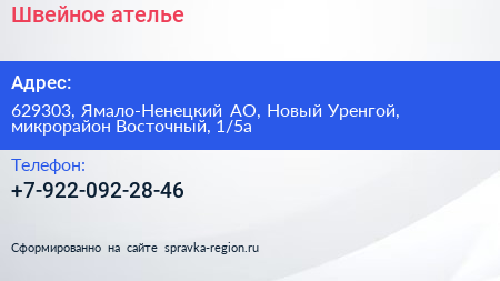 Швейное ателье по адресу 629303, Ямало-Ненецкий АО, Новый Уренгой, микрорайон Восточный, 1/5а в дальнейшем Организация, размещена в следующих категориях: