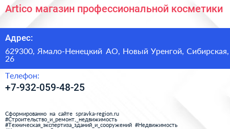 Artico, магазин профессиональной косметики по адресу 629300, Ямало-Ненецкий АО, Новый Уренгой, Сибирская, 26 в дальнейшем Организация, размещена в следующих категориях: