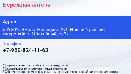 Бережная аптека по адресу 629309, Ямало-Ненецкий АО, Новый Уренгой, микрорайон Юбилейный, 5/2а в дальнейшем Организация, размещена в следующих категориях: