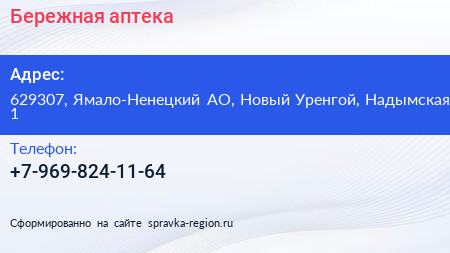 Бережная аптека по адресу 629307, Ямало-Ненецкий АО, Новый Уренгой, Надымская, 1 в дальнейшем Организация, размещена в следующих категориях: