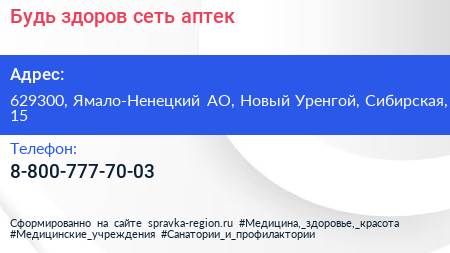 Будь здоров!, сеть аптек по адресу 629300, Ямало-Ненецкий АО, Новый Уренгой, Сибирская, 15 в дальнейшем Организация, размещена в следующих категориях: