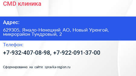 CMD, клиника по адресу 629305, Ямало-Ненецкий АО, Новый Уренгой, микрорайон Тундровый, 2 в дальнейшем Организация, размещена в следующих категориях: