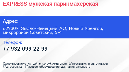 EXPRESS, мужская парикмахерская по адресу 629309, Ямало-Ненецкий АО, Новый Уренгой, микрорайон Советский, 5-4 в дальнейшем Организация, размещена в следующих категориях:
