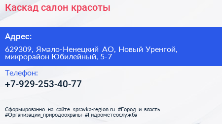 Каскад, салон красоты по адресу 629309, Ямало-Ненецкий АО, Новый Уренгой, микрорайон Юбилейный, 5-7 в дальнейшем Организация, размещена в следующих категориях: