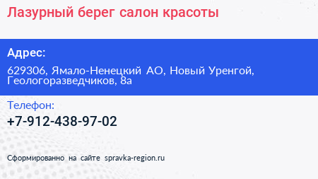 Лазурный берег, салон красоты по адресу 629306, Ямало-Ненецкий АО, Новый Уренгой, Геологоразведчиков, 8а в дальнейшем Организация, размещена в следующих категориях: