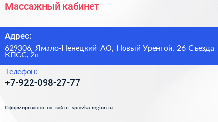 Массажный кабинет по адресу 629306, Ямало-Ненецкий АО, Новый Уренгой, 26 Съезда КПСС, 2в в дальнейшем Организация, размещена в следующих категориях: