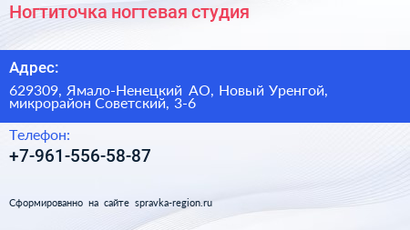 Ногтиточка, ногтевая студия по адресу 629309, Ямало-Ненецкий АО, Новый Уренгой, микрорайон Советский, 3-6 в дальнейшем Организация, размещена в следующих категориях: